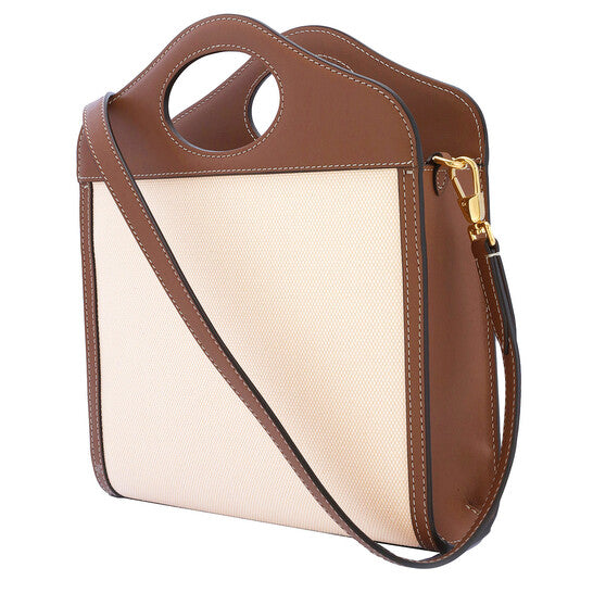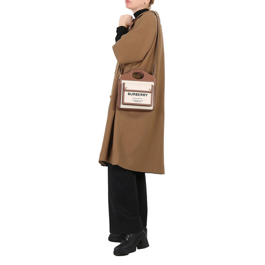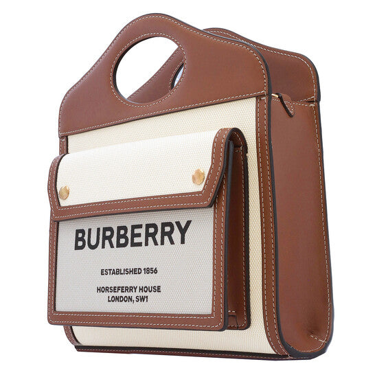 The Burberry Mini Pocket Tote Bag in Natural/Malt Brown is a modern interpretation of the brand’s iconic heritage design. Crafted in Italy, this compact tote features Burberry’s signature Horseferry print along with the London headquarters address displayed on the front. Finished with contrasting stitching, dual top handles, and a functional pocketed layout, it offers everyday versatility with a distinctly British aesthetic.