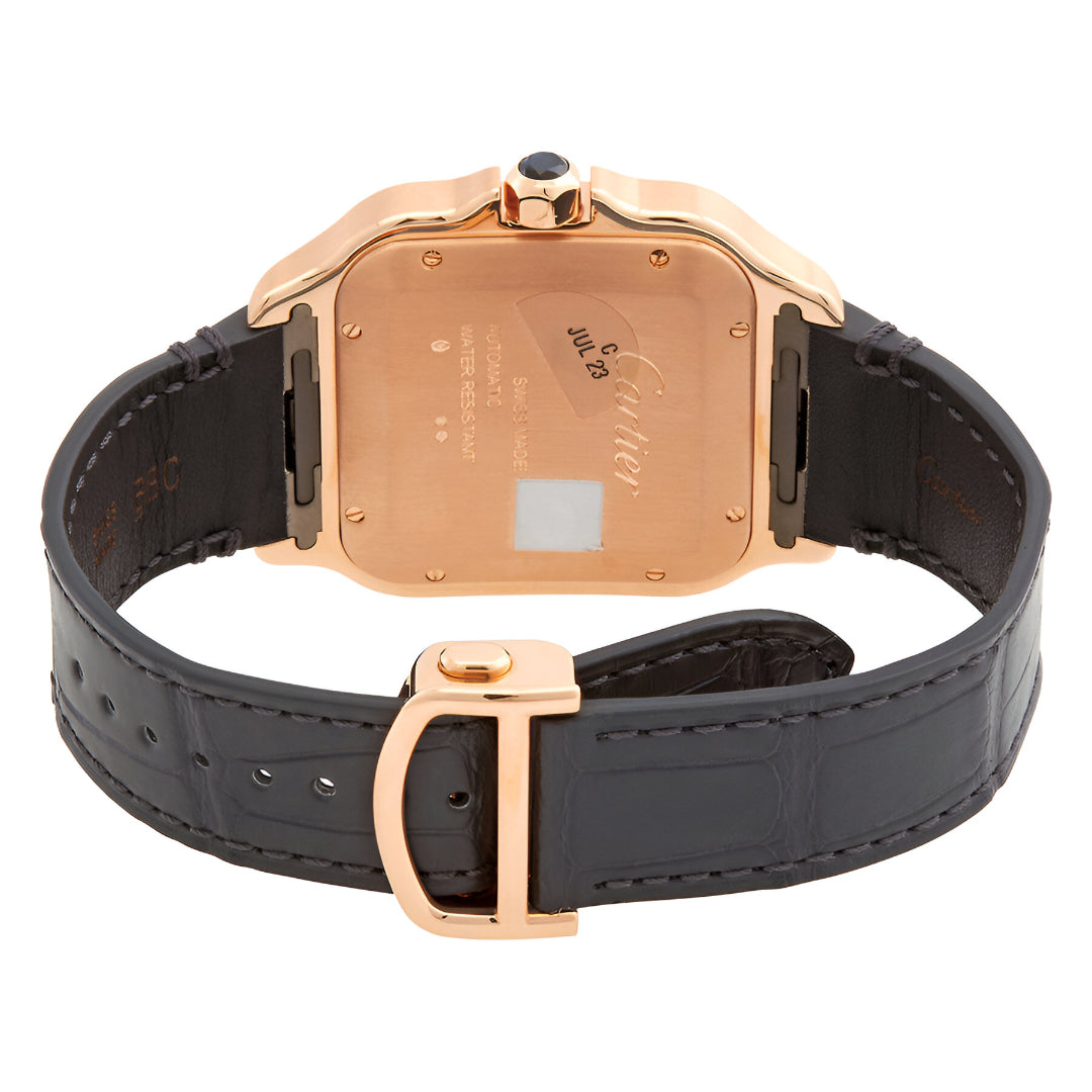 The Cartier Santos Automatic Silver Dial Men’s Watch (Model WGSA0019) blends Cartier’s signature square design with an 18kt rose gold case and a sophisticated grey leather strap. Featuring a silver-tone dial with blued-steel sword-shaped hands and Roman numeral markers, this timepiece delivers classic Cartier styling powered by the Cartier Calibre 1847 MC automatic movement with a 42-hour power reserve. Crafted with a scratch-resistant sapphire crystal, solid case back, and 100-meter water resistance, it is a luxurious yet durable choice for men who value timeless design, precious-metal construction, and everyday refinement.