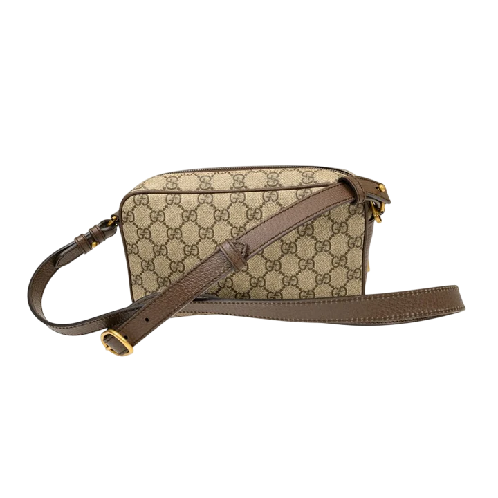 Crafted from beige and ebony GG Supreme canvas with brown leather trim, the design is elevated by gold-toned hardware that accentuates its iconic form. The detachable canvas shoulder strap ensures multiple carry options, making it the perfect companion for both daily wear and refined occasions.