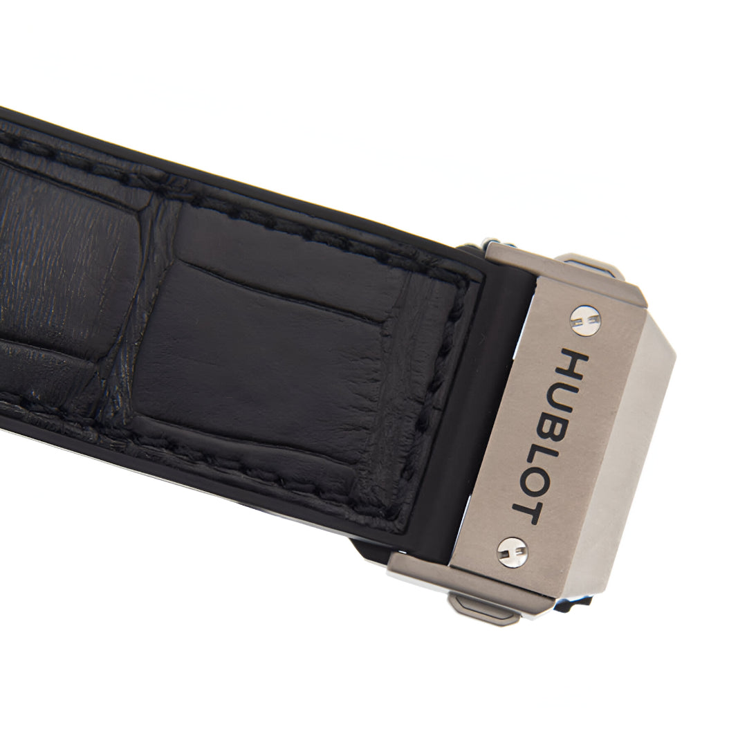 The Hublot Spirit of Big Bang Chronograph combines avant-garde engineering, luxury materials, and a striking tonneau-shaped design. Crafted in titanium with a diamond-set bezel, paired with a rubber strap featuring a black alligator inlay, this timepiece delivers bold aesthetics and high-performance mechanics powered by the Swiss-made HUB4700 automatic chronograph movement. With its skeletonized dial, luminous hands, and robust 100-meter water resistance, it stands as a premium statement piece built for style and substance.