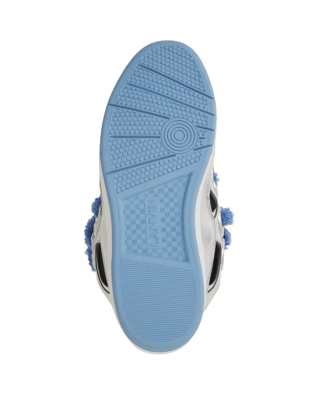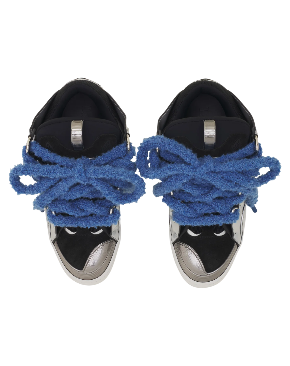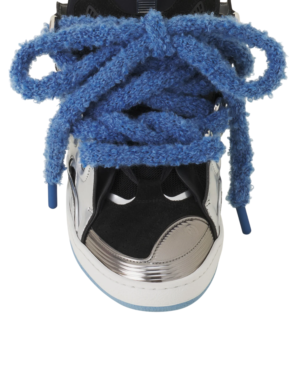 Expertly crafted in Italy, the sneaker combines shimmering silver metallic leather with technical mesh inserts for a futuristic yet refined aesthetic. The oversized woven mesh laces, a defining Lanvin hallmark, complement the chunky padded design and sculpted rubber sole, ensuring both standout style and lasting comfort.