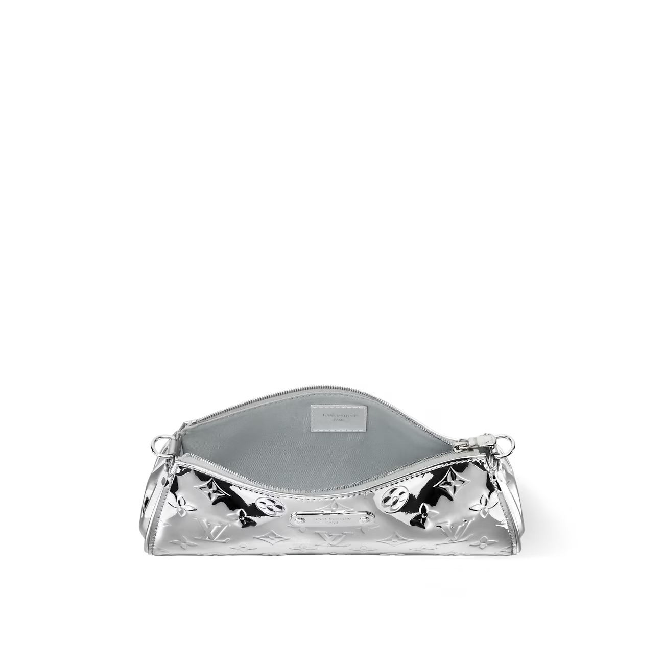 Crafted from Monogram Miroir coated canvas, the pouch shines with its reflective silver tone, complemented by silver-toned hardware and a Louis Vuitton–engraved front plaque that highlights its signature heritage. The removable chain strap allows for versatile styling — carried by hand, on the shoulder, or as a clutch — making it an effortlessly chic companion for any occasion. Inside, a spacious main compartment holds essentials like a smartphone, earphones, a Romy wallet, and keys, blending style with functionality in true Louis Vuitton fashion.