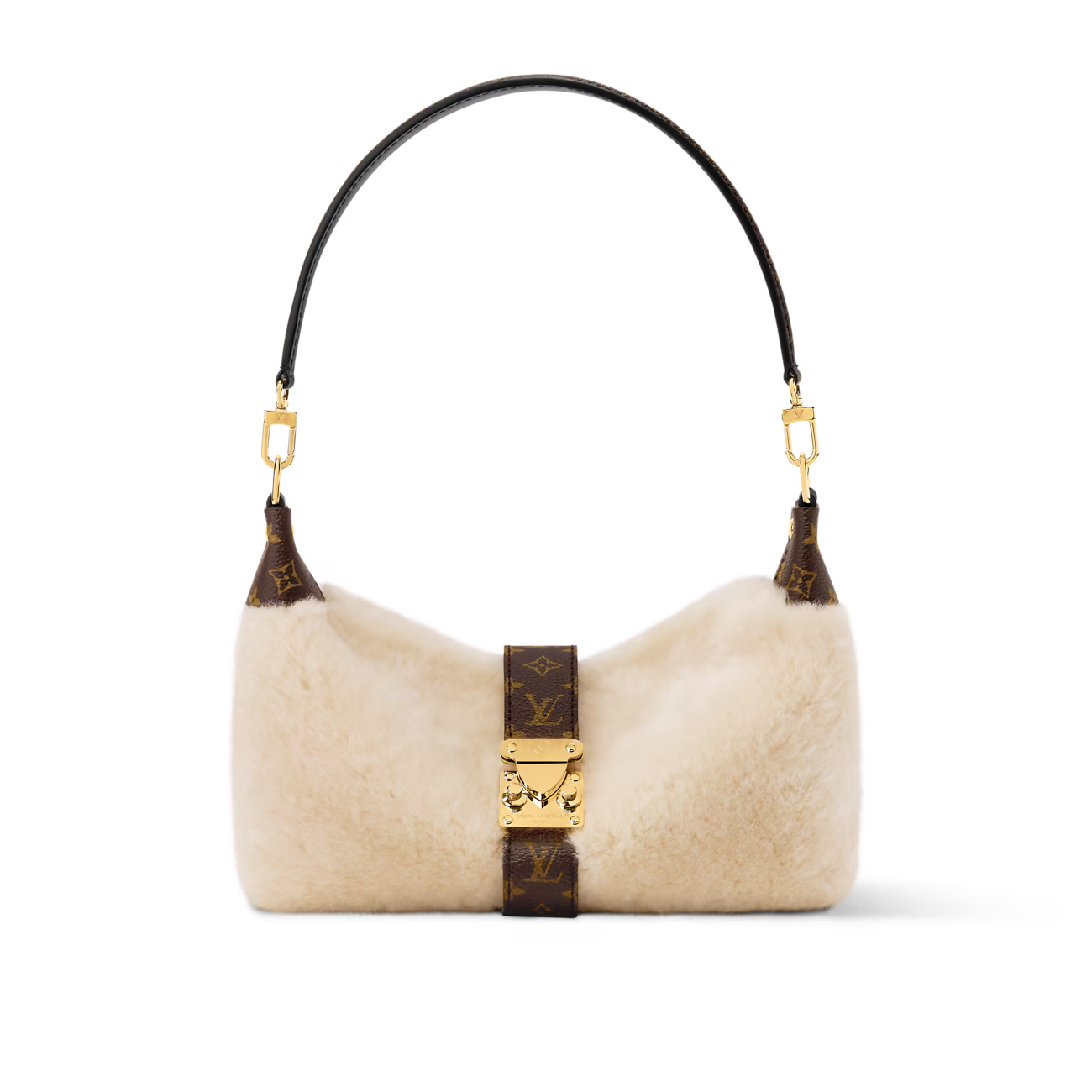 Crafted from sumptuous cream shearling, the bag is beautifully contrasted with Monogram coated-canvas trim, blending softness with the Maison’s iconic aesthetic. The gold-toned hardware adds a polished finish, while the magnetic S-lock closure—a hallmark of Louis Vuitton’s heritage—secures the bag with understated sophistication. The removable single handle allows for versatile styling, whether carried by hand or worn as an accent piece for any occasion.